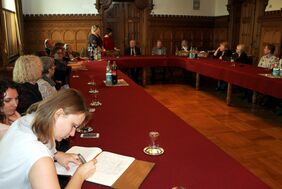„Es ist mir eine Freude und Ehre, Sie in unserem Ratssaal begrüßen zu dürfen“ so hieß Erenbürgermeister Dr. Karl Birker 32 Gäste aus Helmstedts weißrussischer Partnerstadt Swetlogorsk willkommen. Die Gäste sind seit knapp einer Woche zu Gast in Helmstedt und sind in der Politischen Bildungsstätte untergebracht. Birker informierte die Gäste über die Stadtgeschichte sowie über den historischen Ratssaal mit seinen Schmuckfenstern. Für die Übersetzung sorgte die Gast-Dolmetscherin Lena Bukatschowa. Reiseleiterin Swetlana Drosd bedankte sich für den herzlichen Empfang und überreichte als Gastgeschenk einen Bildband sowie landestypische Süßigkeiten.