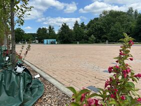 Nicht zuletzt wird der Stellplatz darüber hinaus durch rund 60 Bäume und Sträucher umrahmt, die dem Platz mittelfristig ein naturnahes Ambiente verleihen werden, Schatten spenden und den Platz weiter aufwerten werden. Neben Säulenahornbäumen und Säulenhainbuchen wurden diverse Sträucher gepflanzt.