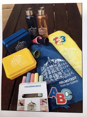 Warum nicht auch in der Schule seine Verbundenheit zu seiner Heimatstadt bekunden? Mit dem Schul-Set, bestehend aus Trinkflasche, Brotdose, Rucksack und einem Satz Straßenmalkreide bietet die Stadt Helmstedt diese Utensilien für den täglichen Gebrauch im Bürgerbüro zum Kauf an.