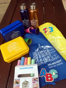 Warum nicht auch in der Schule seine Verbundenheit zu seiner Heimatstadt bekunden? Mit dem neuen Schul-Set, bestehend aus Trinkflasche, Brotdose, Rucksack und einem Satz Straßenmalkreide bietet die Stadt Helmstedt diese Utensilien für den täglichen Gebrauch im Bürgerbüro zum Kauf an.