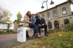 Foto: Sie weihen die neue SmartBench am Helmstedter Bahnhof ein (von links): Linda Gades, REA, Antje Klimek, Avacon AG, Gunnar Heyms, REA, und Bürgermeister Wittich Schobert.