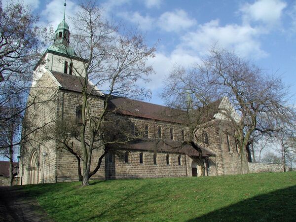 Die heute dreischiffige spätgotische Hallenkirche ist vor 1300 erbaut und Anfang des 15. Jahrhunderts weitgehend erneuert worden. Hier wurde sie mit dem mächtigen Westwerk versehen. Der geplante Turmbau wurde nie ausgeführt.