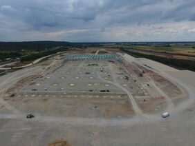 Bereits von der Autobahn aus offenbart sich, dass die Bauarbeiten im Gewerbegebiet mit gewaltiger Dynamik voranschreiten. Noch deutlicher wird dies mit Blick auf die Luftbilder. Ein Teil des Hallenbauwerks ist bereits als Ständerbauwerk sichtbar. Die Betonstützen und –Riegel umreißen derzeit jedoch nur einen kleinen Teil der endgültigen Hallengröße.