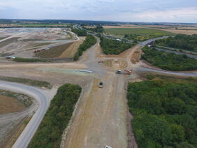 Der Bau des großen Kreisverkehrs an der Autobahn wird vorbereitet. Noch im Spätsommer wird der Einbau von Asphalt beginnen, so dass die Straßen bald im vollen Umfang sichtbar werden. Kanäle und Versorgungsleitungen sind weitgehend eingebaut. Rückhaltebecken und Ausgleichsflächen sind weitgehend fertig konturiert.