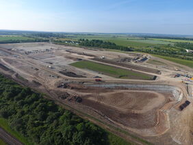 Die Konturen des Gebietes werden auch aus der Sicht des Vorbeifahrens oder Spazierengehens klarer erkennbar. Noch besser lassen sich die Fortschritte der Bodenbewegungen und die gewaltigen Abmessungen des Gebietes natürlich aus der Vogelperspektive erkennen. Die Vertiefungen für die an verschiedenen Stellen erforderlichen Rückhaltebecken sind weitgehend ausgehoben.