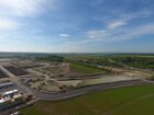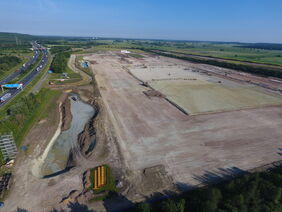 Die öffentlichen und privaten Verkehrsflächen sind mit ersten Auffüllungen und Bodenverbesserungen versehen. Die Umrisse der großen Hallenbaues zeichnen sich bereits deutlich ab. Erste Ver- und Entsorgungsleitungen und Verteilbauwerke sind eingebaut.