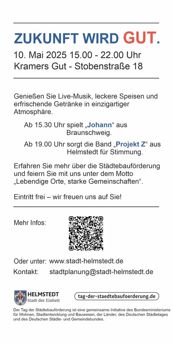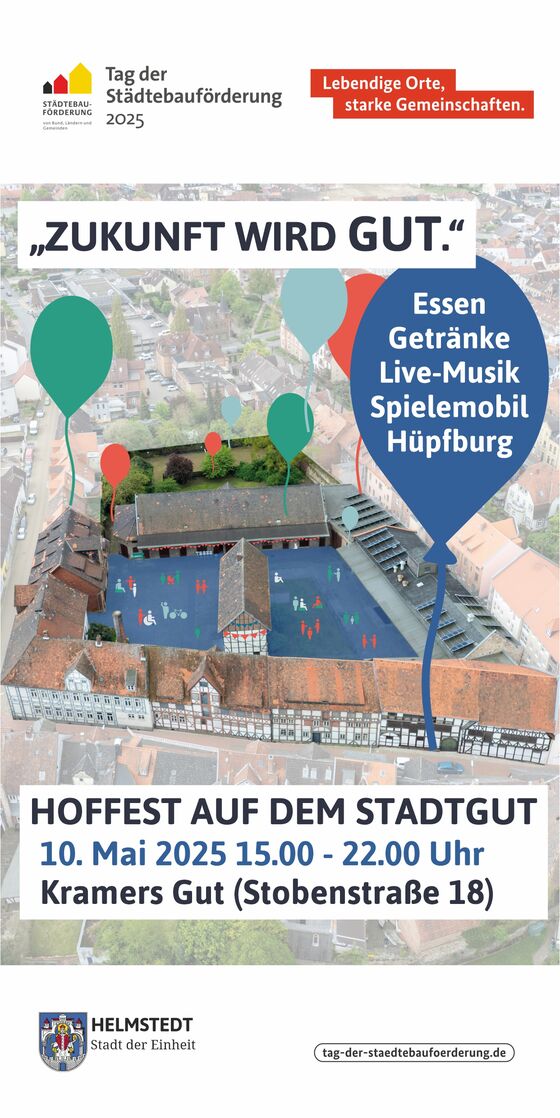 Die Stadt Helmstedt beteiligt sich am bundesweiten Aktionstag und lädt am Samstag, den 10. Mai 2025, ab 15.00 Uhr auf Kramers Gut zu „ZUKUNFT WIRD GUT“ ein.